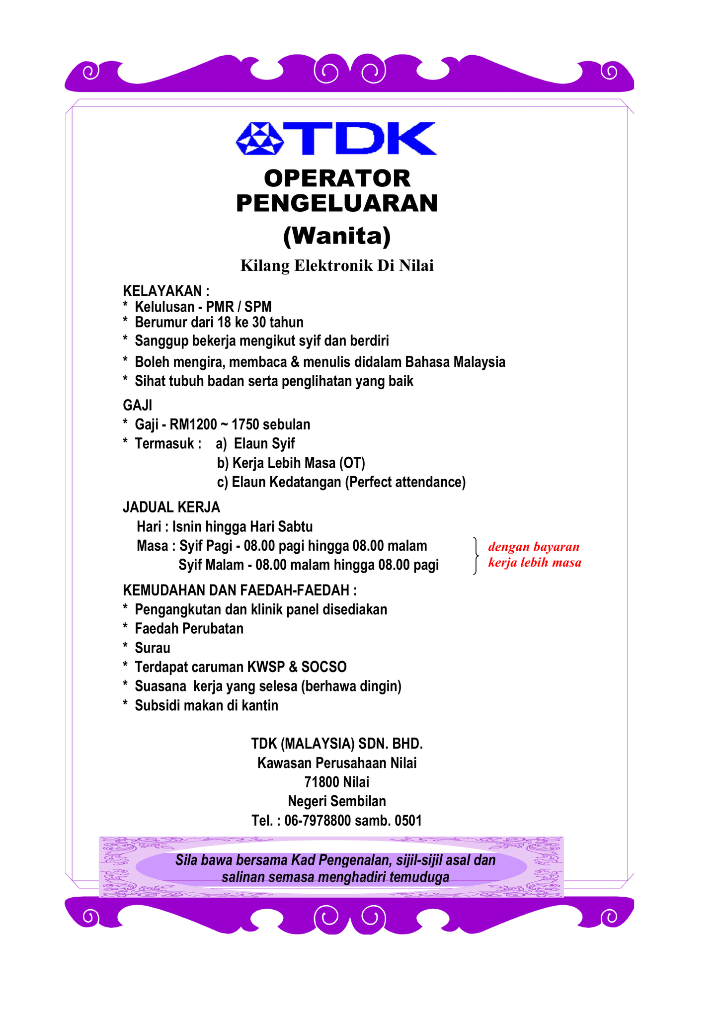 Jobsmalaysia Negeri Sembilan On Twitter 40 Kekosongan Operator Pengeluaran Wanita Di Tdk Malaysia Sdn Bhd Nilai Mohon Sekarang Di Https T Co 7l6pvv05zd Atau Boleh Datang Terus Ke Kilang Untuk Temuduga Pada Hari Bekerja Https T Co