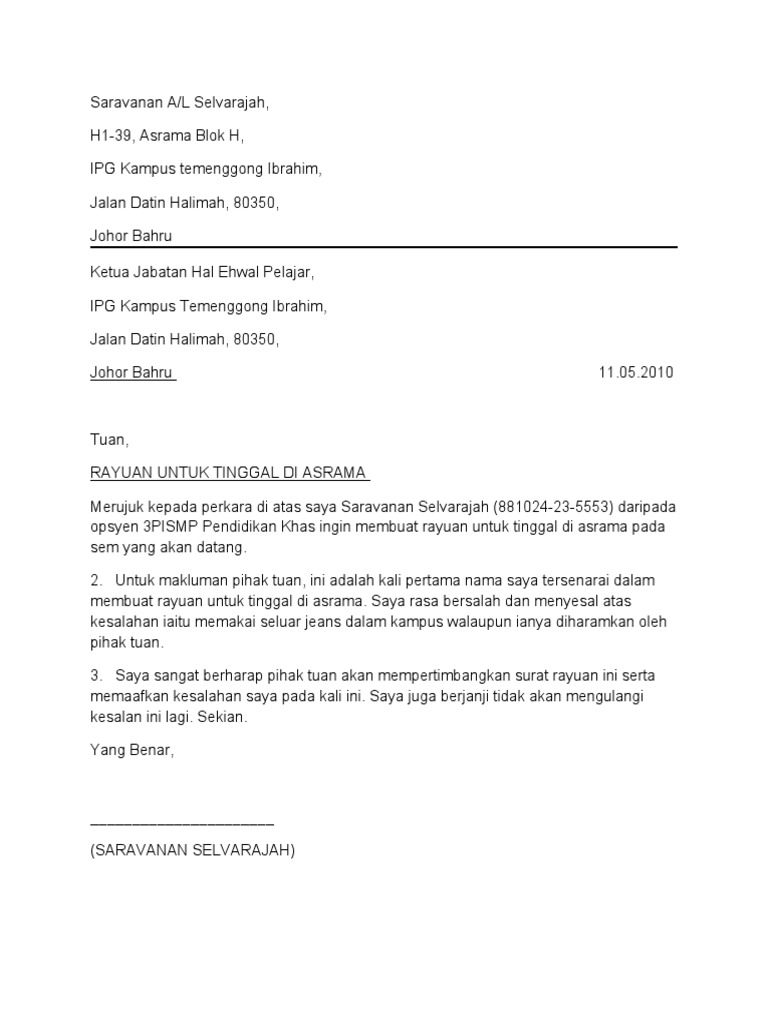 Contoh surat permohonan asrama 1. Surat tersebut harus menerangkan secara terperinci tentang tujuan khusus surat itu dikeluarkancontohnyalawatan sambil belajar zoo negara. Pdf contoh surat rayuan eg tukar zuebir othman academia edu.